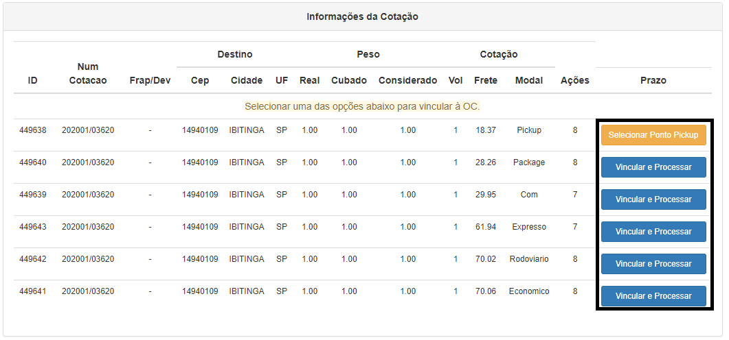Selecione a modalidade desejada e clique no botão [Vincular e Processar]